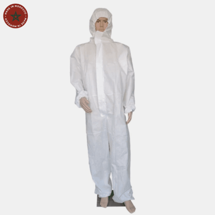 La combinaison est fabriquée en utilisant un laminé de polyéthylène et de polypropylène de haute qualité. Cette combinaison de matériaux assure une barrière robuste contre les liquides, les particules et les aérosols potentiellement contaminés.